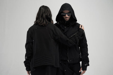 Womenswear channels the raw energy of Static Empire through bold textural contrasts and subcultural references. The range merges full crochet-knit styles with heavy jersey, creating a balance between fragility and strength. Perfecto-style biker silhouettes define the structure — cut close to the body for a sharp, rebellious fit.