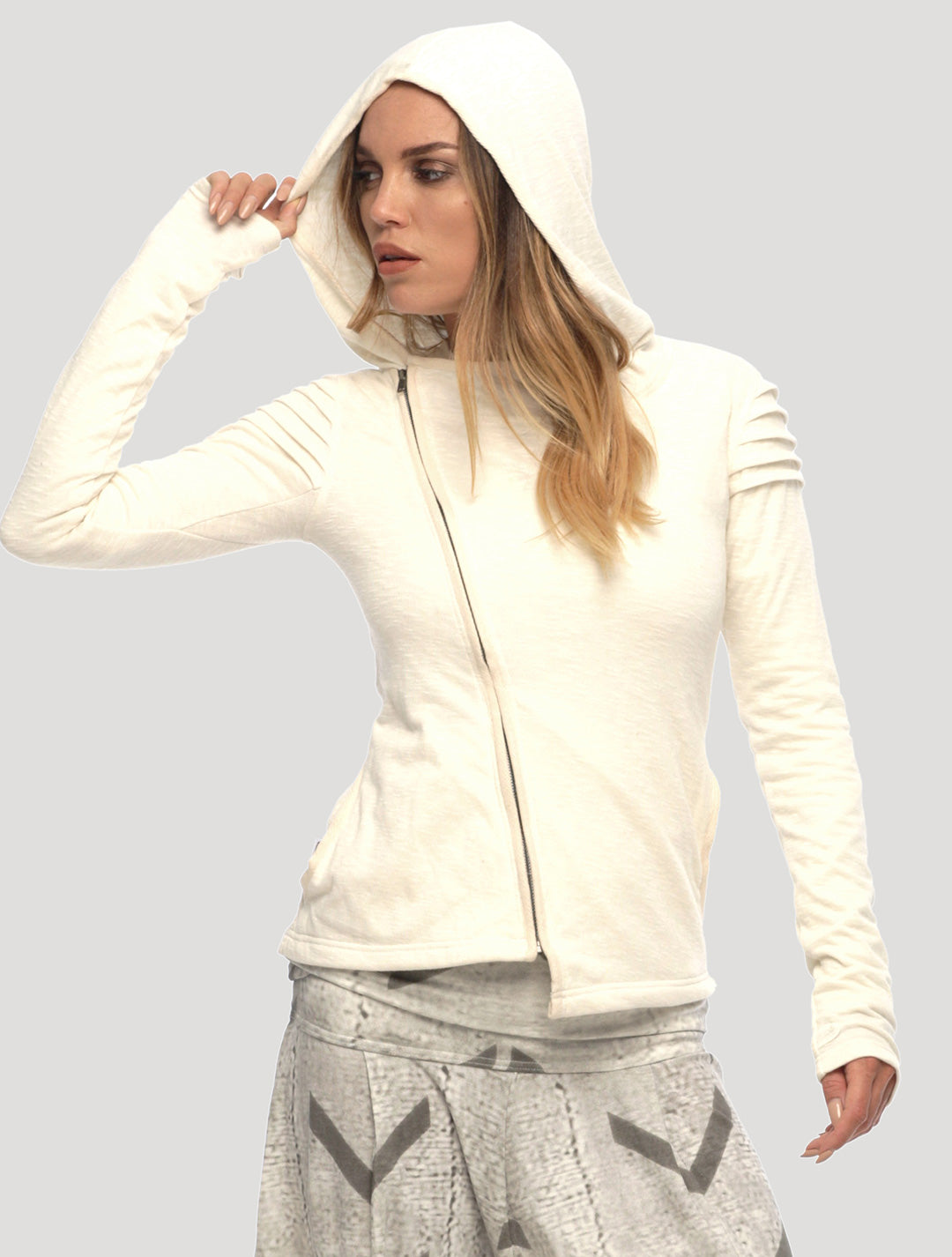 * Hoodie light jacket with off-centered, diagonal zipped front closure.