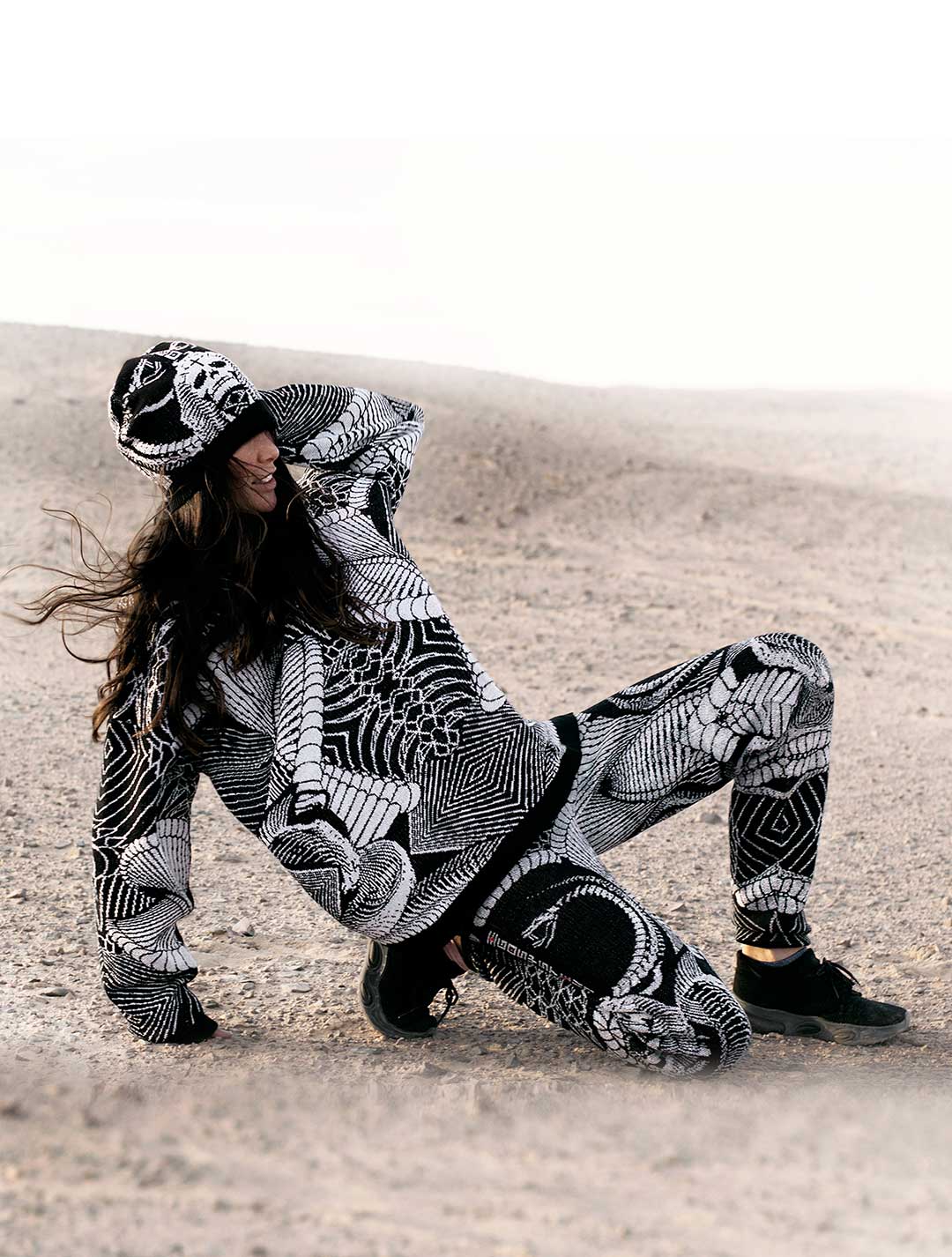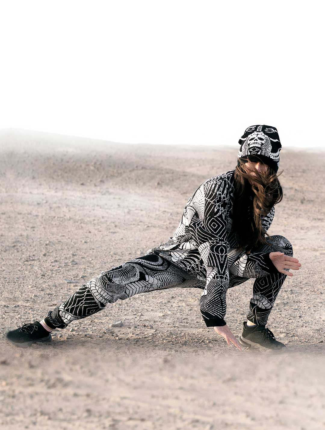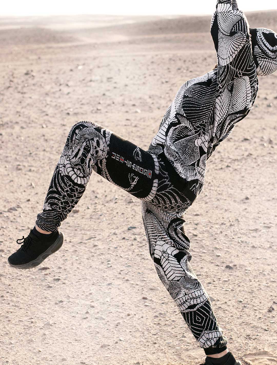 Slim-fit knit trousers designed to flatter, crafted in a sustainable hemp blend for natural comfort and durability. Featuring an all-over black and white jacquard knit, the design weaves together serpentine curves, skeletal forms, and sacred geometry, creating a striking fusion of futuristic edge and ancient symbolism. Apocalypto unlocks the mysteries behind theology and belief systems, which often centre around cryptic revelations of a divine intervention in history, the judgment of humanity, the salvation of devoted followers, and the eventual reign of select few in an afterlife rebirth. These pants channel that energy, turning each wear into a statement of esoteric style. Tapered, with ribbed cuffs for a sleek silhouette. Wear with the matching Apocalypto sweater for full impact, or pair with basics to let the pants speak for themselves