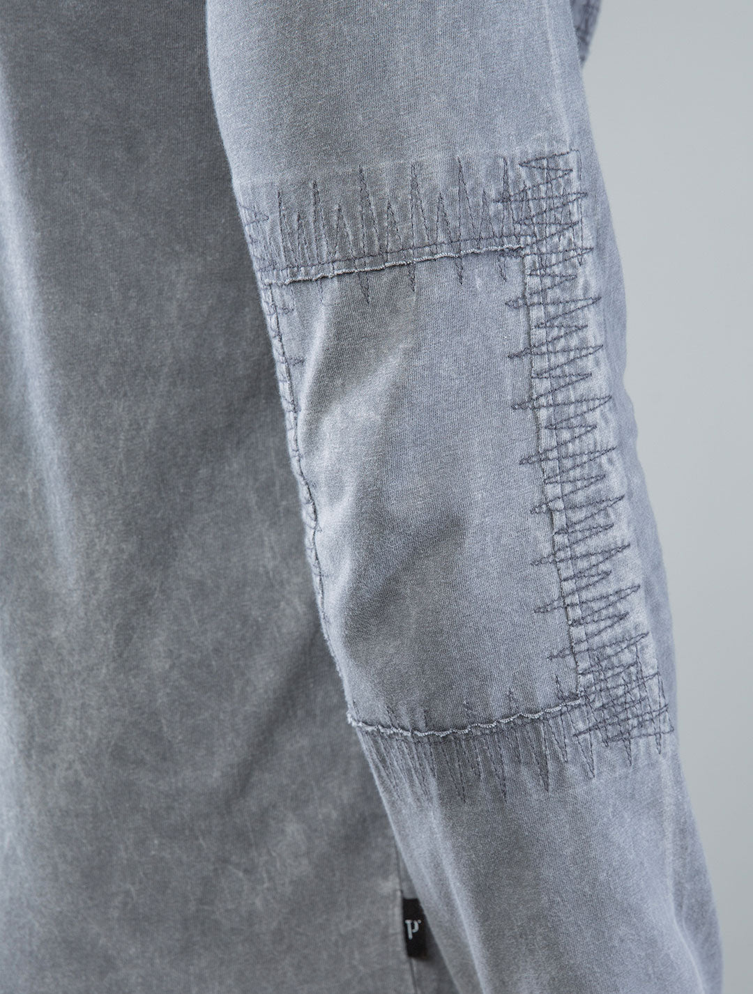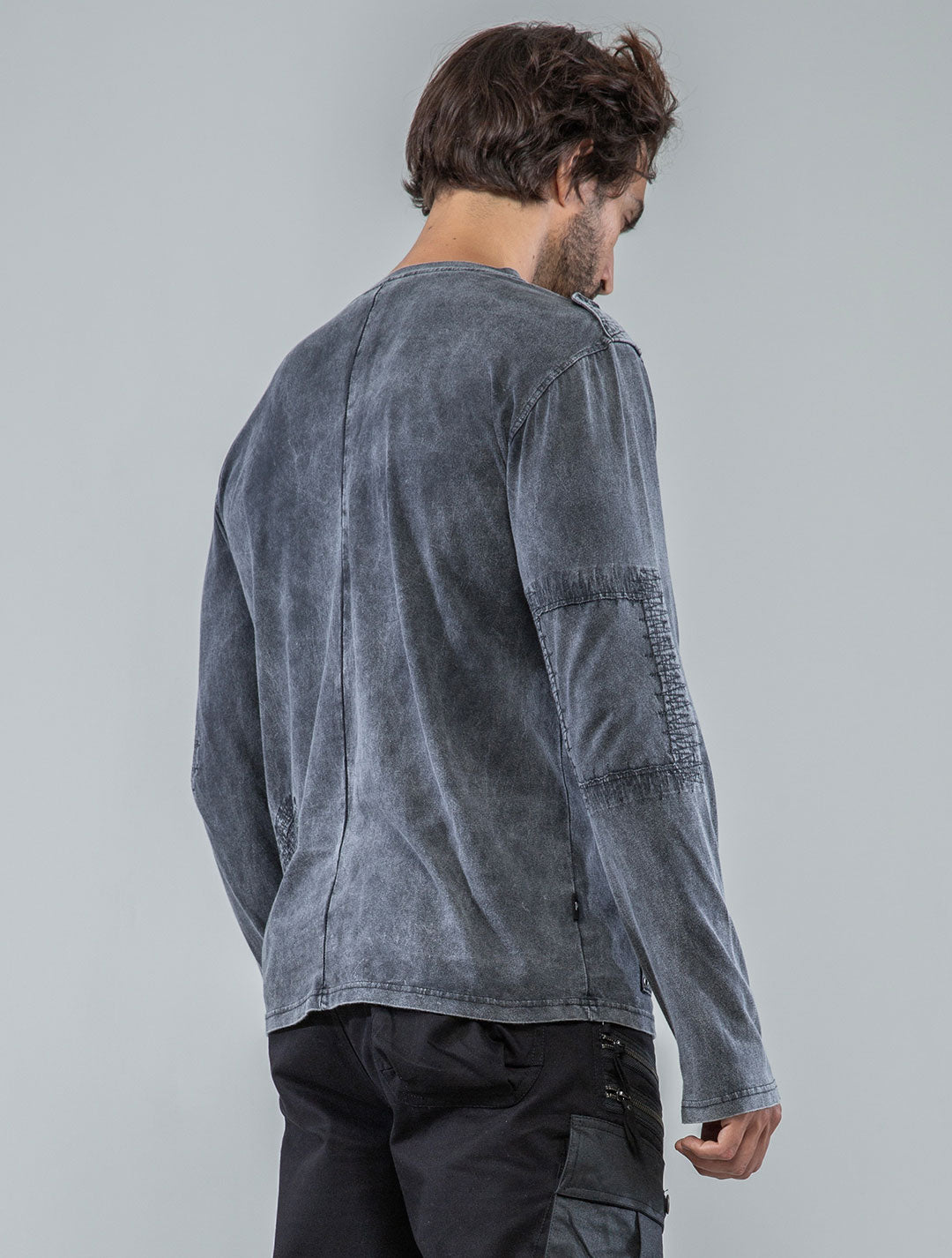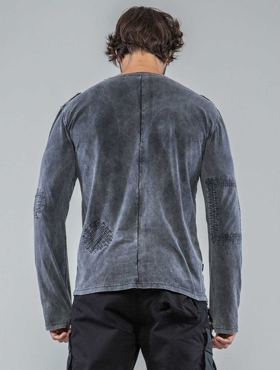 Inspired by Control — the cult punk Joy Division Film — this long-sleeve is a tribute to raw sound, stripped-down style, and lived-in rebellion. Built for those who carry the underground with them. Pigment garment dyed and heavily stone washed, the fabric feels soft, broken-in, and charged with history. Asymmetric shoulder epaulettes with Psylo branded metal buttons bring a military-punk edge. Rips and hand-darned repairs give it an authentic DIY finish. Signature Psylo detailing — twill patch with tarnished metal eyelets and “P” loop label — ground the piece in its roots. Slim on the arms, regular in the body, this is a second skin for the outsider. • Slim arms, regular body fit • Asymmetric shoulder epaulettes with branded metal buttons • Artisanal pigment garment dye with heavy stone wash • Multiple hand-darned repairs for authentic punk finish