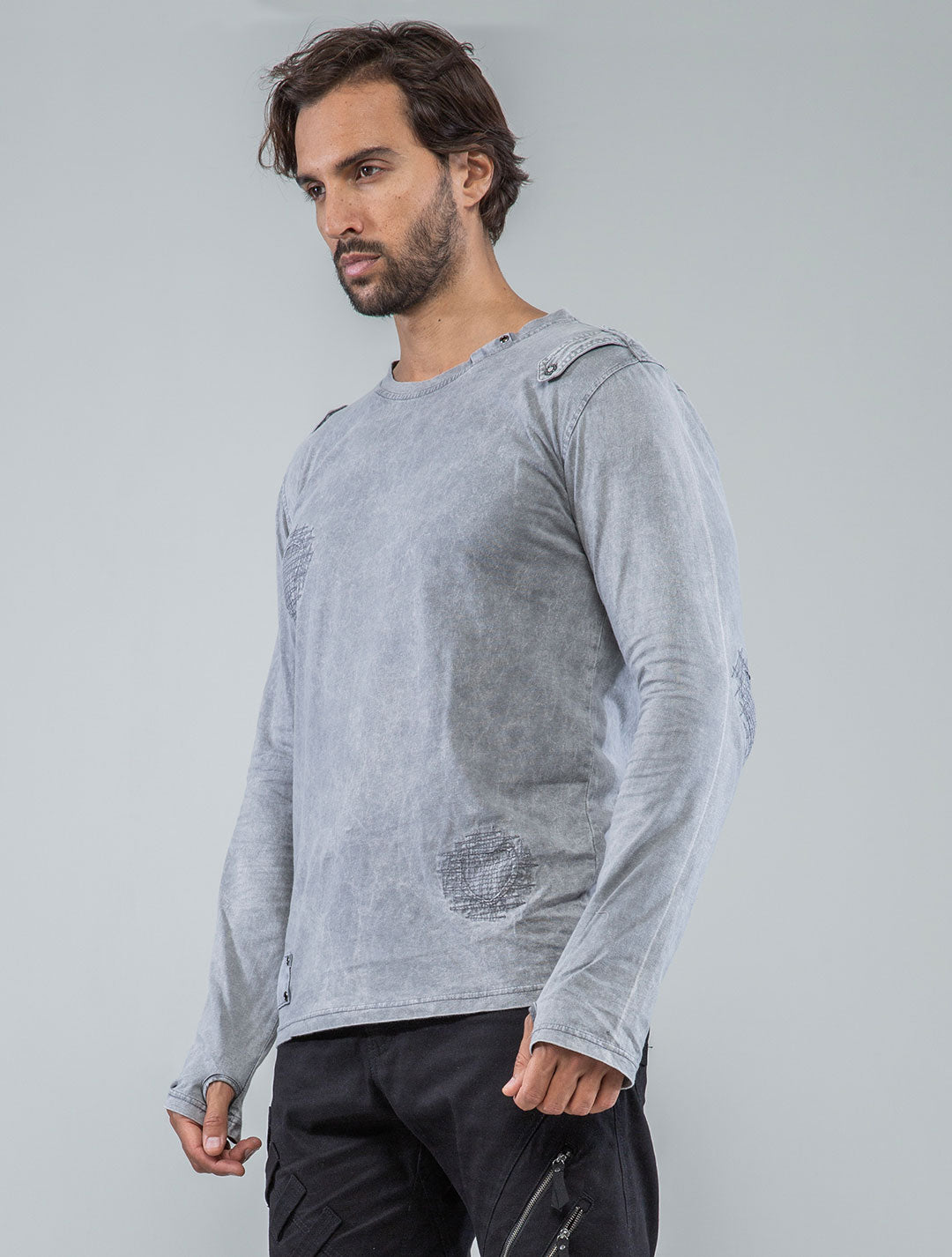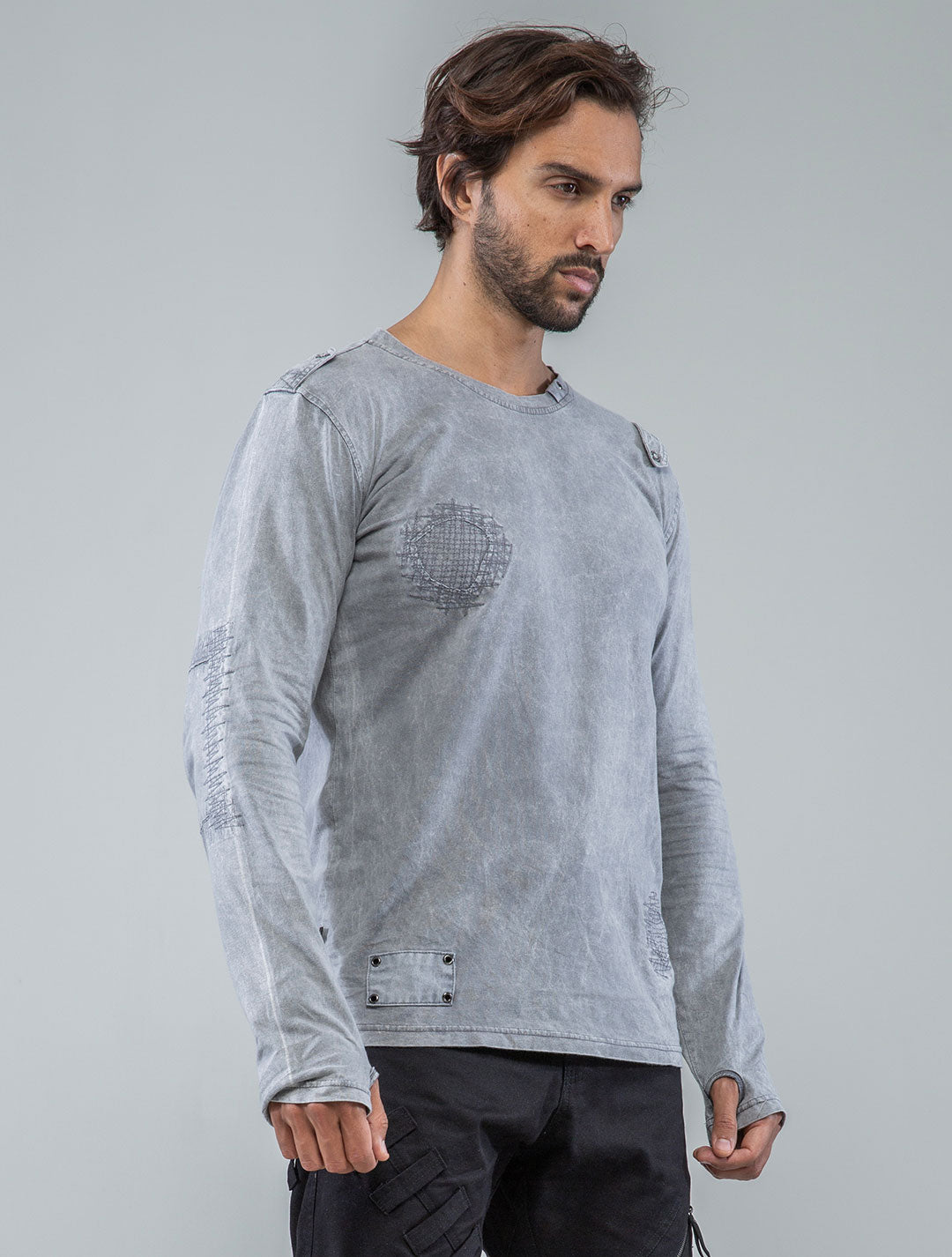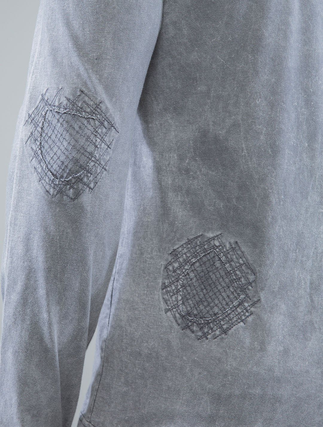 Inspired by Control — the cult punk Joy Division Film — this long-sleeve is a tribute to raw sound, stripped-down style, and lived-in rebellion. Built for those who carry the underground with them. Pigment garment dyed and heavily stone washed, the fabric feels soft, broken-in, and charged with history. Asymmetric shoulder epaulettes with Psylo branded metal buttons bring a military-punk edge. Rips and hand-darned repairs give it an authentic DIY finish. Signature Psylo detailing — twill patch with tarnished metal eyelets and “P” loop label — ground the piece in its roots. Slim on the arms, regular in the body, this is a second skin for the outsider. • Slim arms, regular body fit • Asymmetric shoulder epaulettes with branded metal buttons • Artisanal pigment garment dye with heavy stone wash • Multiple hand-darned repairs for authentic punk finish