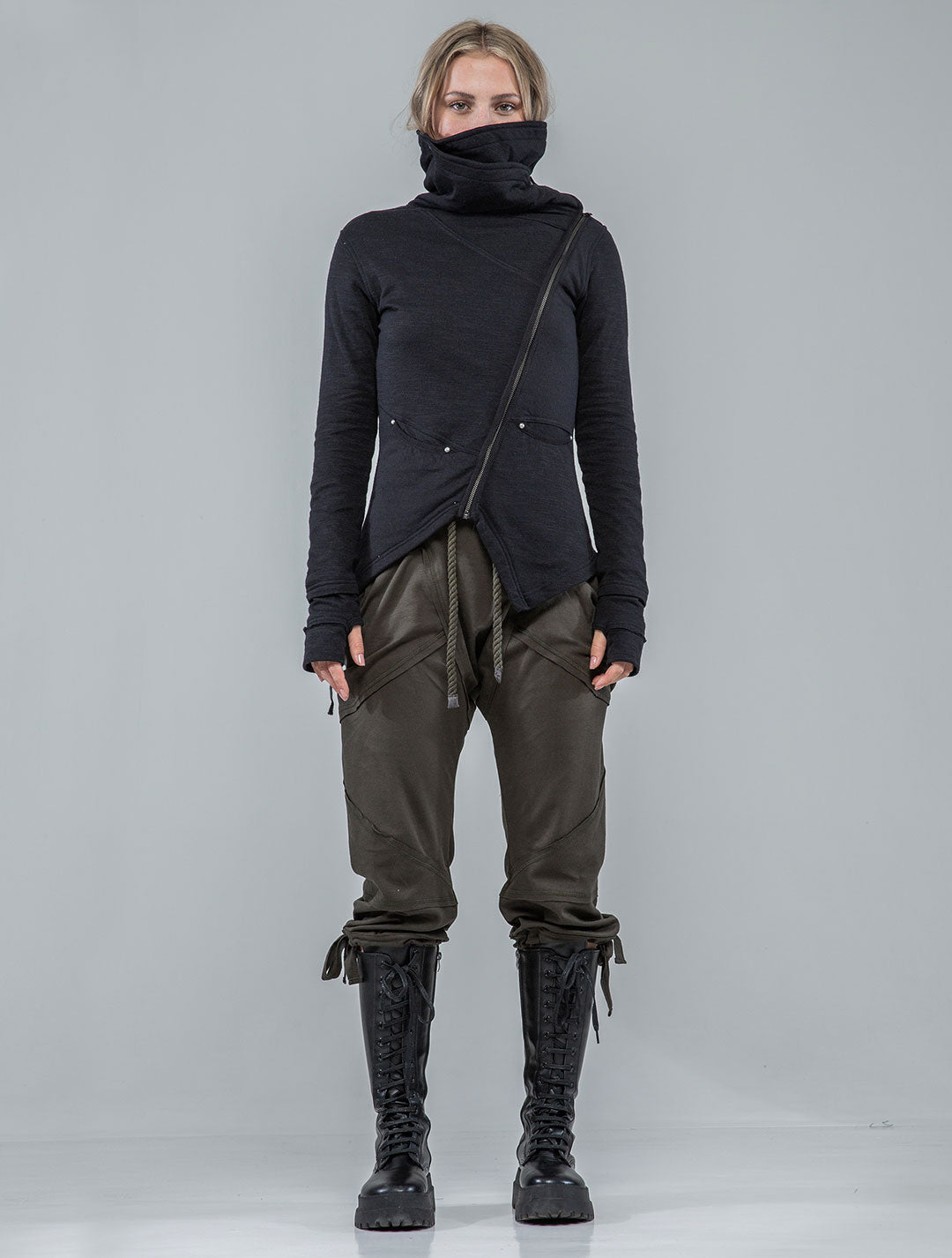 Inspired by Dystopia — the underground crust punk/sludge metal band from California — this jacket reimagines the classic perfecto biker with a lighter, sharper street edge. Designed to sculpt the body and flare at the hem, it blends punk rebellion with modern tailoring for a clean yet subversive silhouette. Cut from soft yet structured CVC slub double knit, the jacket features a slim fit through the torso, finished with a sharp asymmetric hemline. The signature cowl neck can be styled zipped high for a protective, future-punk look or folded down for a relaxed drape, secured with metal snap buttons. Asymmetric gape pockets trimmed with herringbone tape and tarnished studs bring utilitarian grit, while the angled metal zipper and raw seam finishing give it an industrial, lived-in feel.