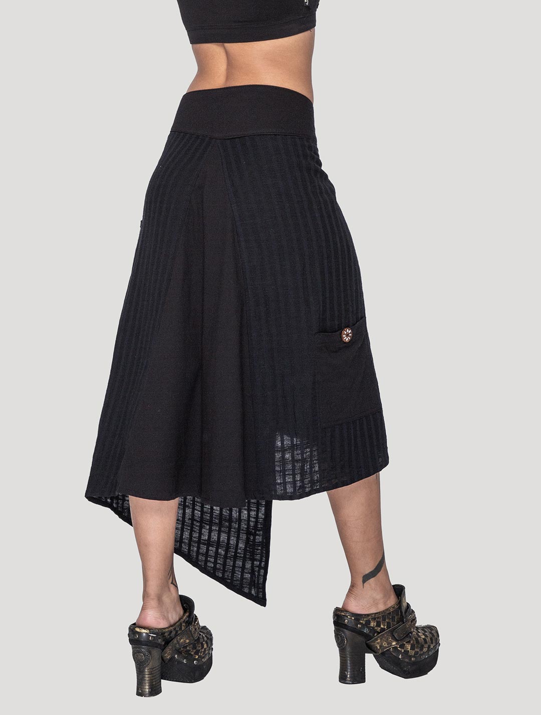 With 5 rows of adjustable sustainable coconut buttons on the waist, the Hera Wrap Skirt is designed to fit multiple body sizes. Featuring functional side pockets, this mixed fabric skirt with an asymmetric hem is an enigmatic future classic.