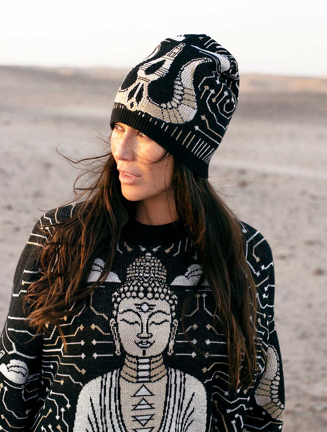 This soft and breathable knit beanie made with hemp blend yarns. Featuring the signature Sansara design with bold circuit lines and symbolic motifs, this beanie adds a conscious edge to your streetwear with a bold, limited-edition design.