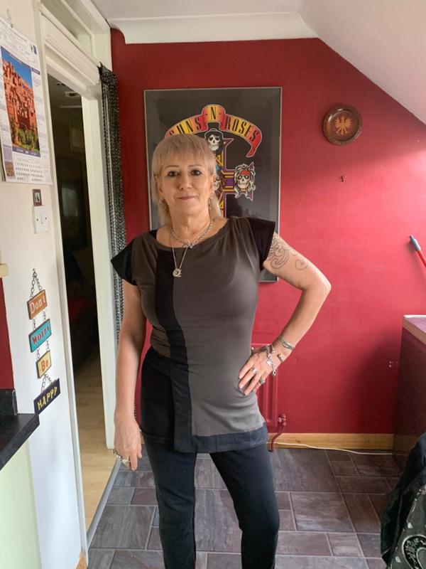 This is a very comfortable top — the material is lovely and soft. It's quite fitted, but the material is stretchy and has some give. Colours work very well, and I like the unusual cut.