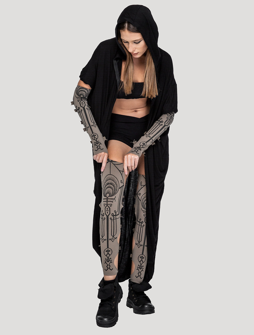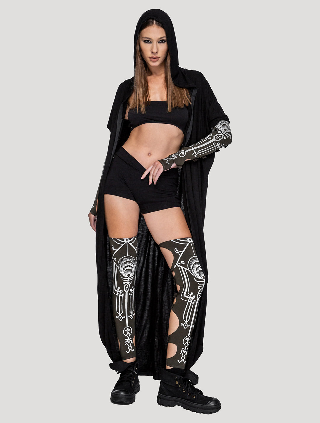 These over-the-knee leg warmers are made with our organic cotton lycra. The lightweight fabric is heavenly soft and super stretchy, making it comfy to wear like a second skin. The rounded cut-outs on the back legs are decorated with "herringbone straps" and custom-made metal studs, adding character to this standout accessory. The unique print illustration by Mahyar Traveler is inspired by Zen Art and is guaranteed to elevate every look.